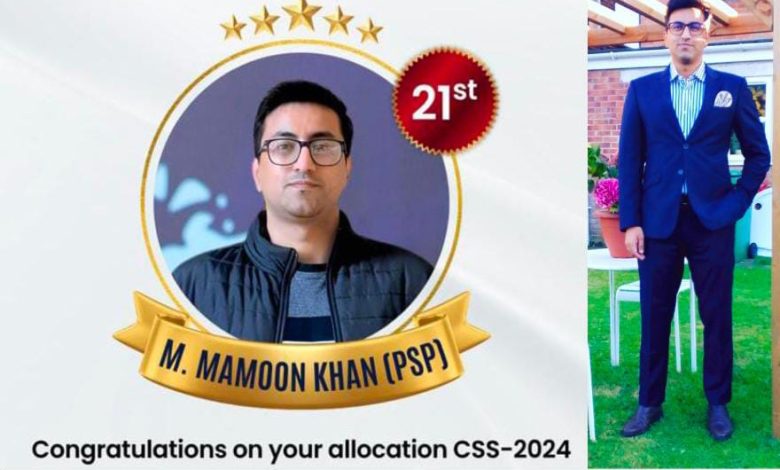 میانوالی سے تعلق رکھنے والے اور لاہور میں مقیم محمد مامون خان نے فیڈرل پبلک سروس کمیشن کے تحت ہونے والے سینٹرل سپیریئر سروسز (CSS) امتحان میں نمایاں کامیابی حاصل کرنے کے بعد پولیس سروس آف پاکستان (PSP) میں تقرری حاصل کر لی ہے۔