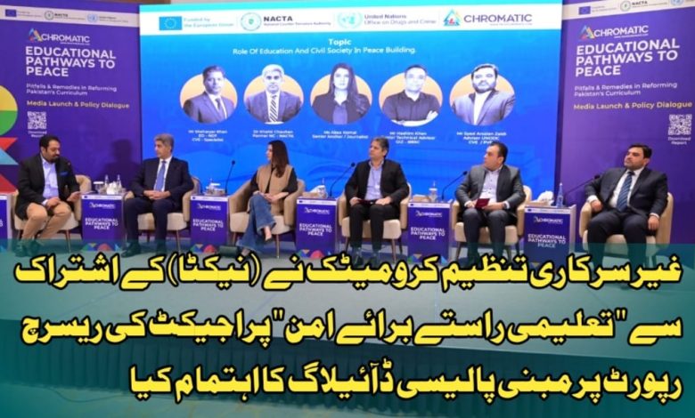 غیر سرکاری تنظیم کرومیٹک نے نیشنل کائونٹر ٹیررازم اتھارٹی (نیکٹا) کے اشتراک اور یورپی یونین اور اقوام متحدہ کے ادارے برائے ممنوعہ منشیات اور بین الاقوامی جرائم کے تعاون سے اسلام آباد میں پراجیکٹ "تعلیمی راستے برائے امن” کی ریسرچ رپورٹ پرمبنی پالیسی ڈائیلاگ اور میڈیا لانچ کی تقریب کا اہتمام کیا۔